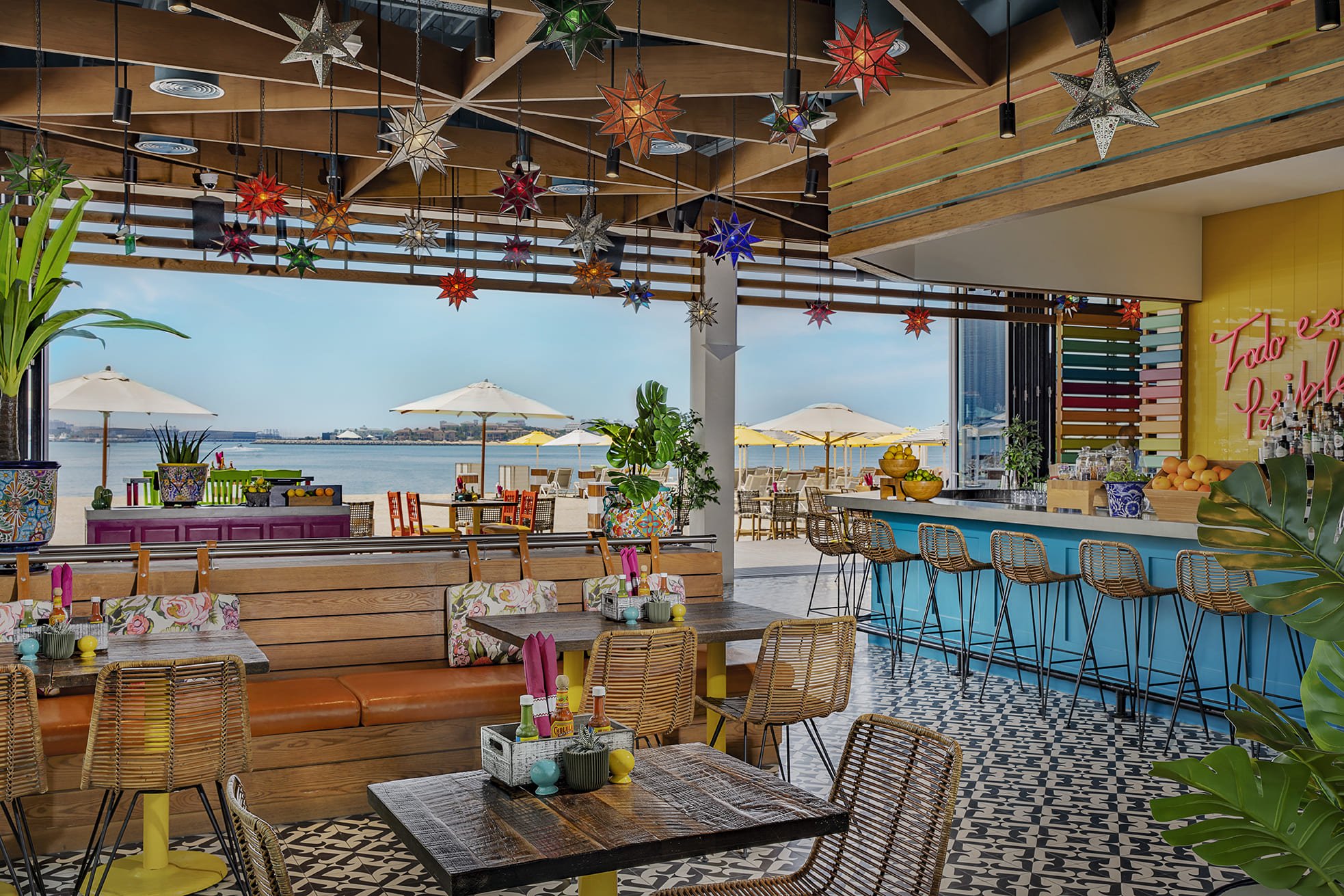 Located on West Palm Beach, with fun and colorful vibes, the restaurant offers its guests (and their pets) a fantastic location and amazing views of the Dubai Marina skyline. The beachfront seating area is packed with happy punters enjoying a casual beachside meal with a side of sea breeze.